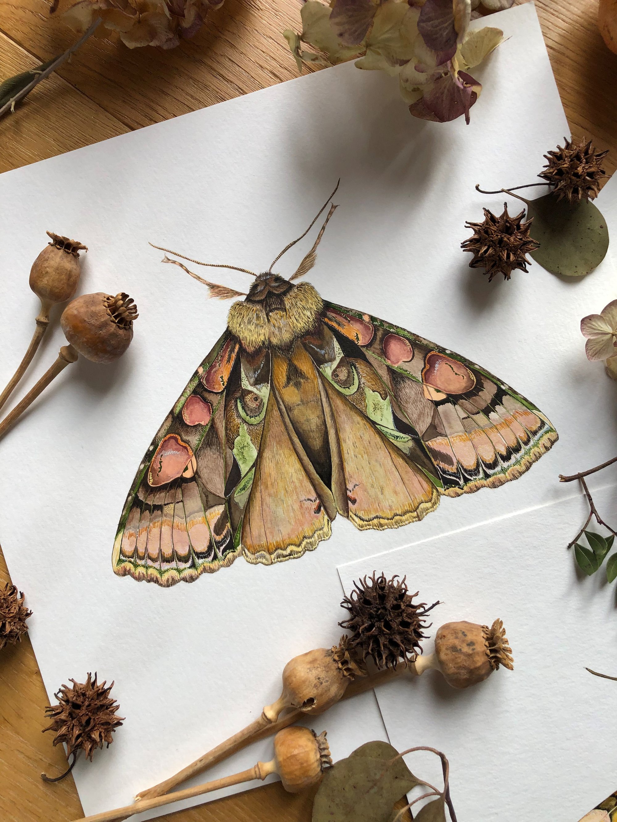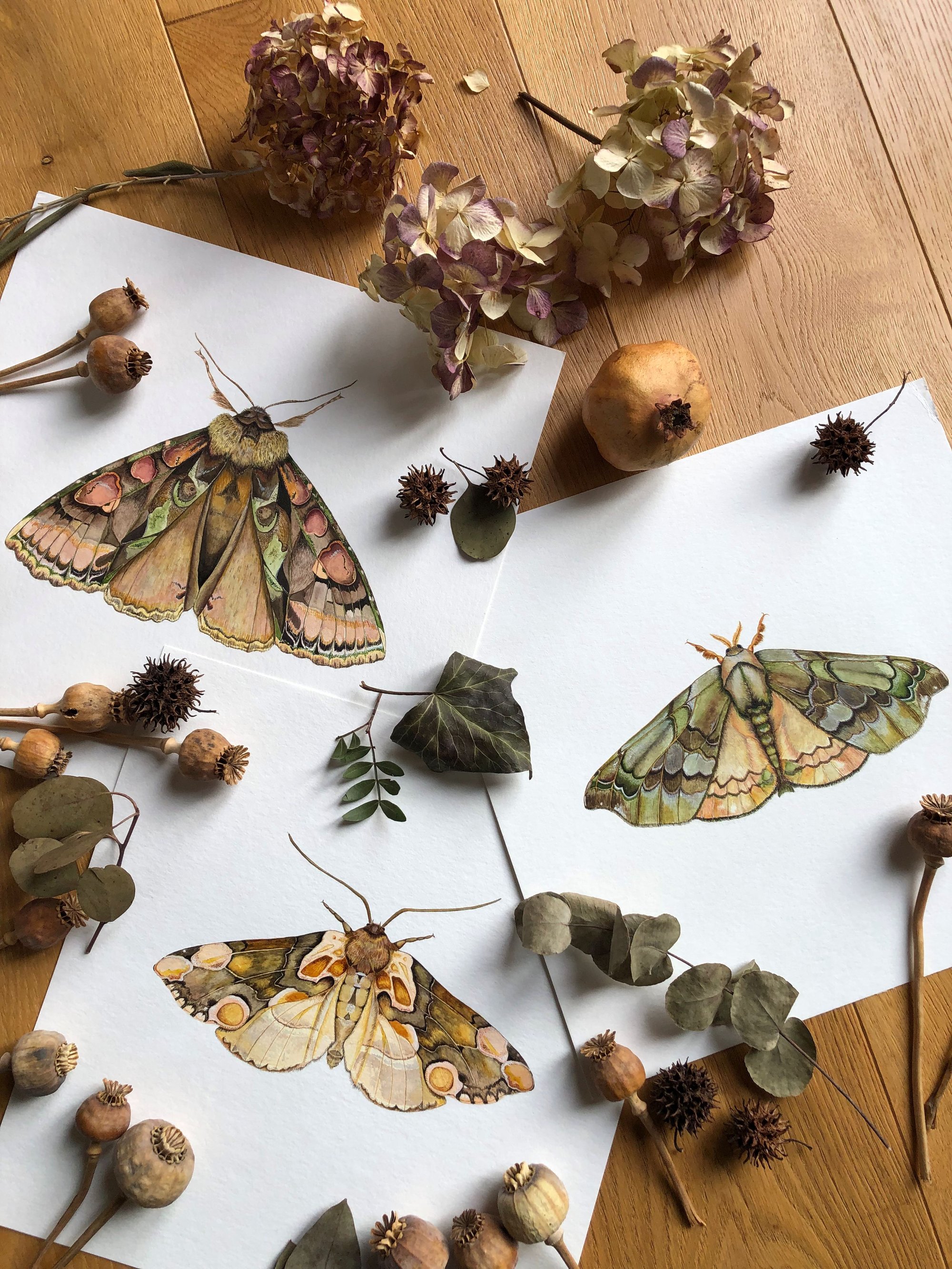 For those who find magic after dark: three exquisite moths painted from life under moonlight, now available as a museum-grade giclée trio on heavy 350 gsm cold-press cotton rag (warm white, softly textured, acid-free).
