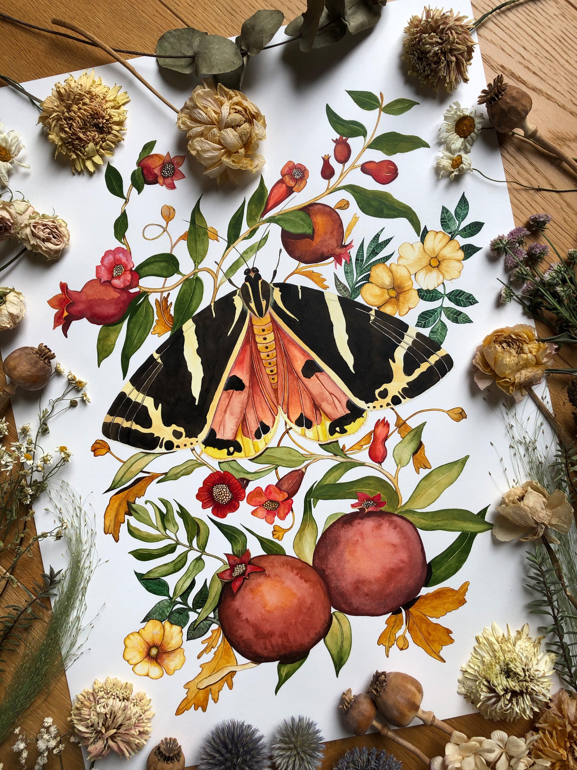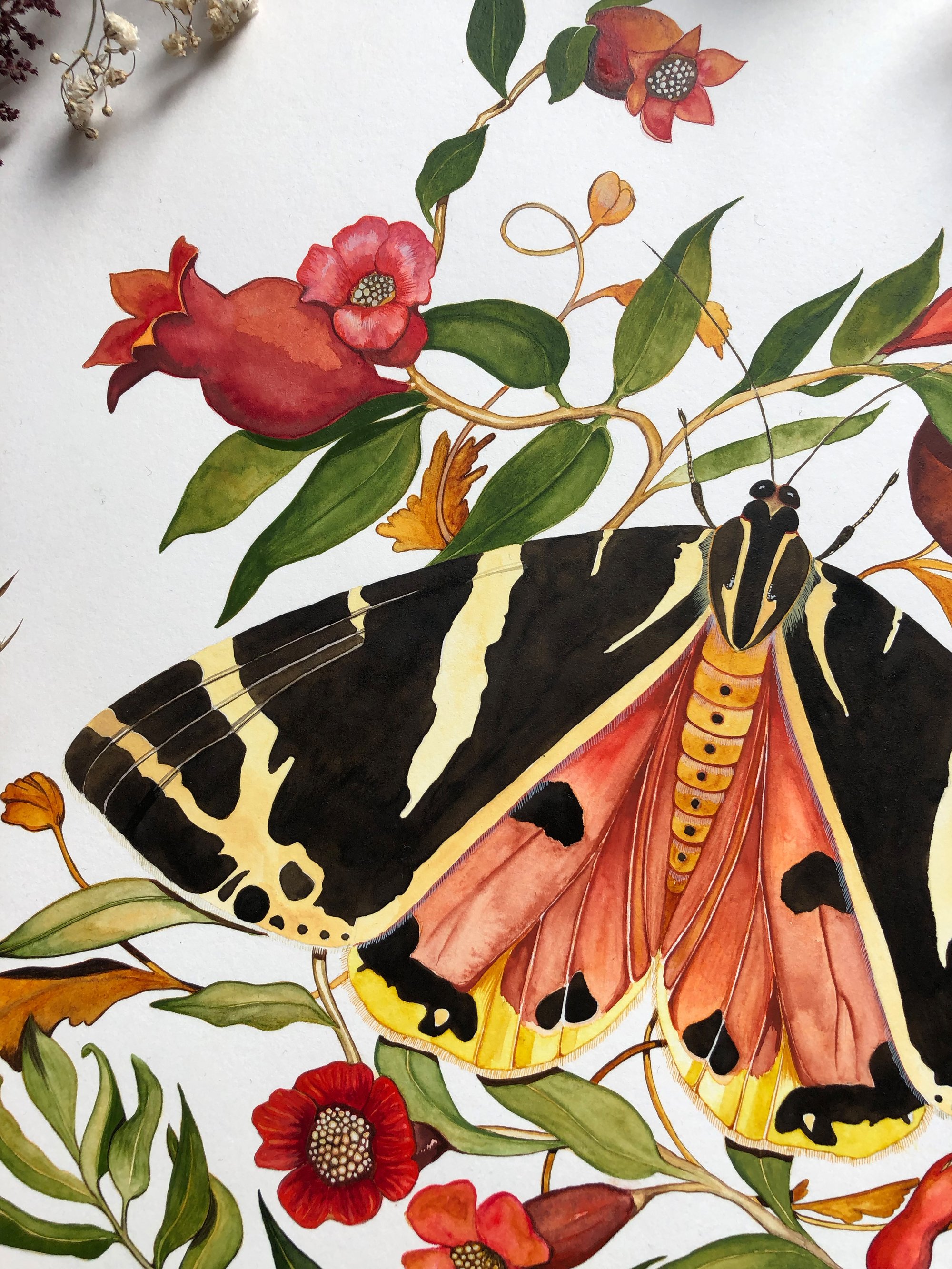 Autumn's Royal Emblem” – Jersey Tiger Moth & Pomegranate Still Life